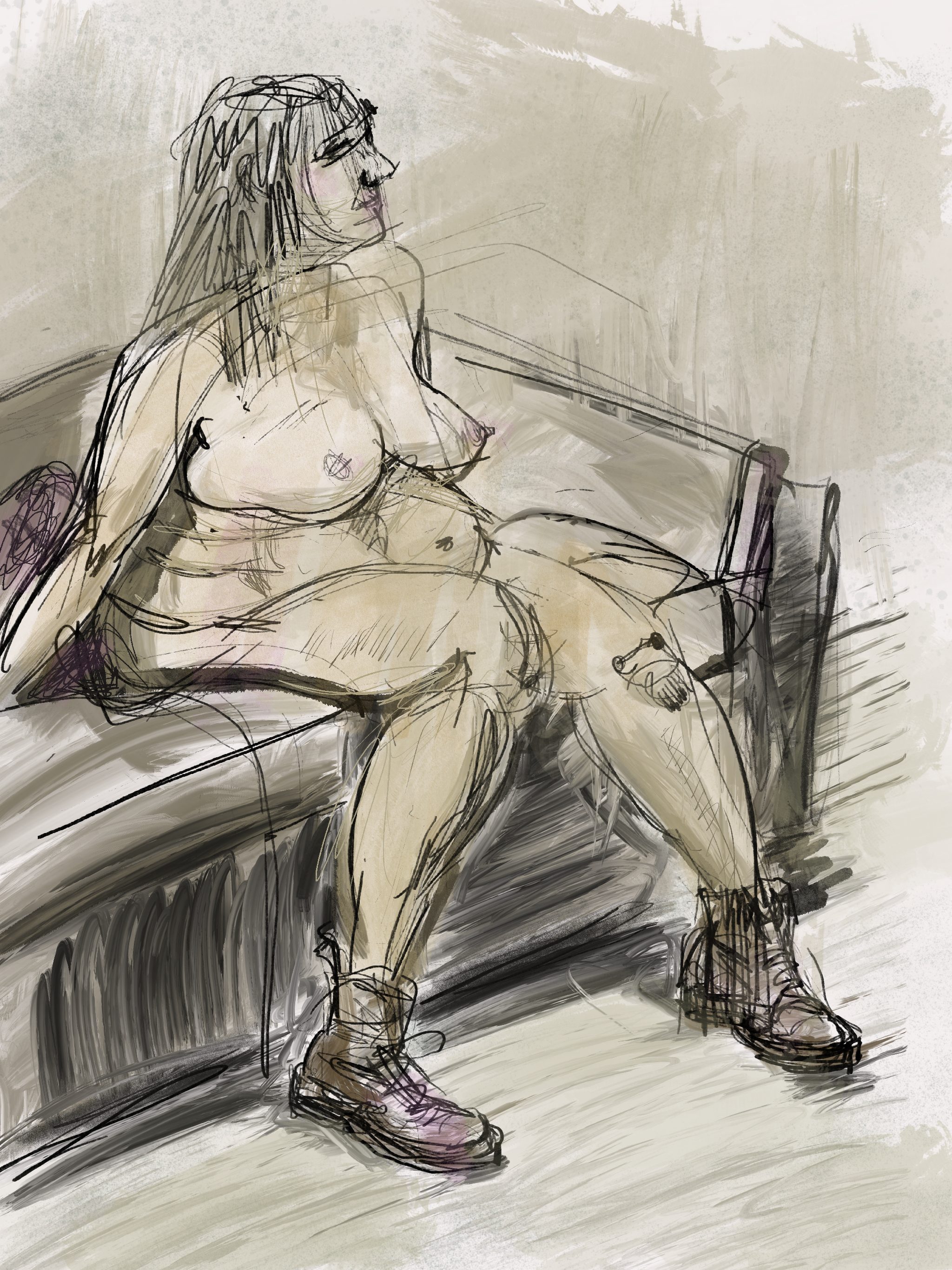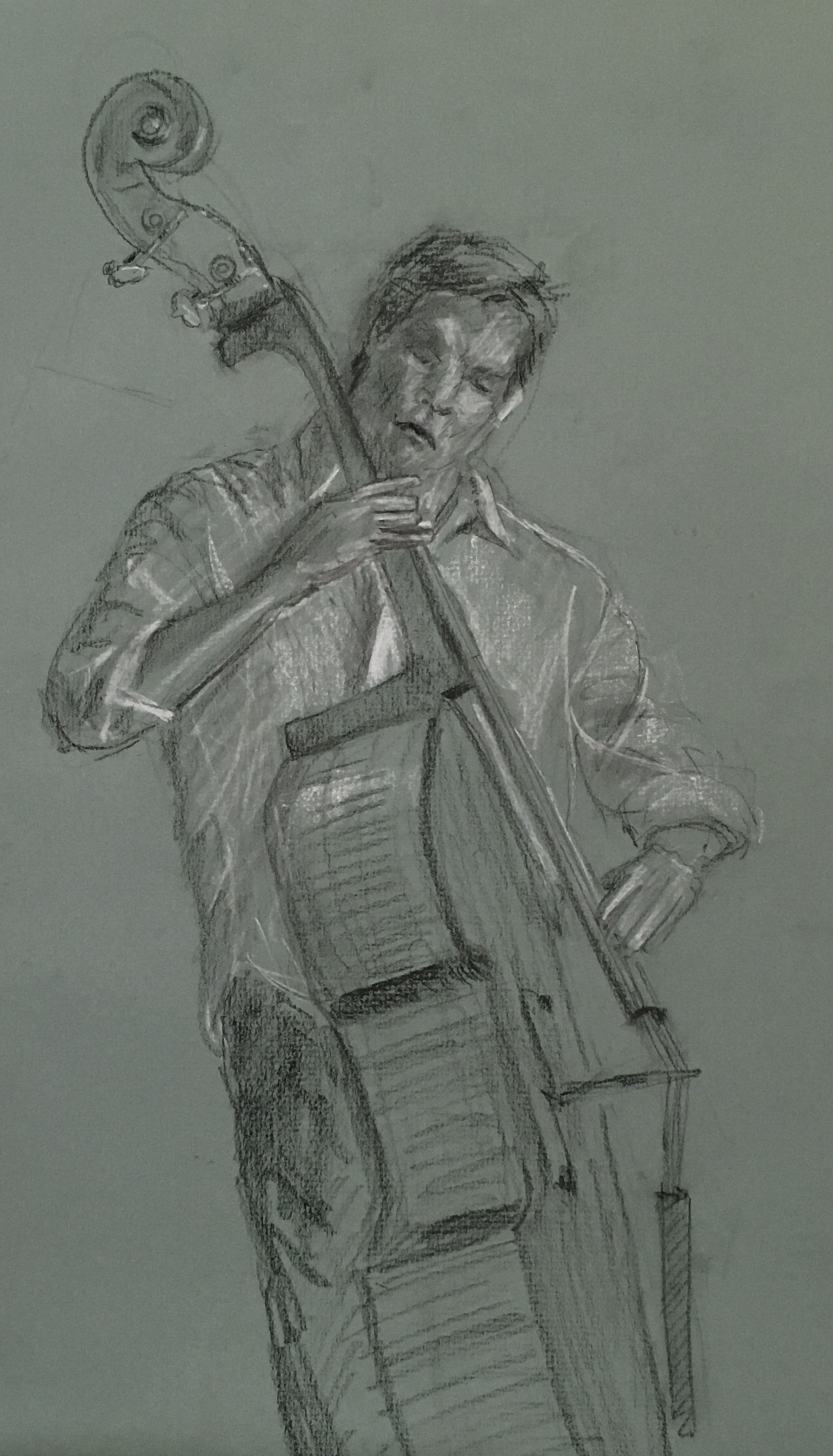 The Saturday drawing sessions at MU consisted of three hours of 20-minute poses. The Sunday sessions were considered “painting” days: one 3-hour pose. Most often, it was nude models, but occasionally costume and props were included. And then there was the time Jeff and his wife, Ruth, played music for us for three hours. No, it did not take me three hours to draw this!