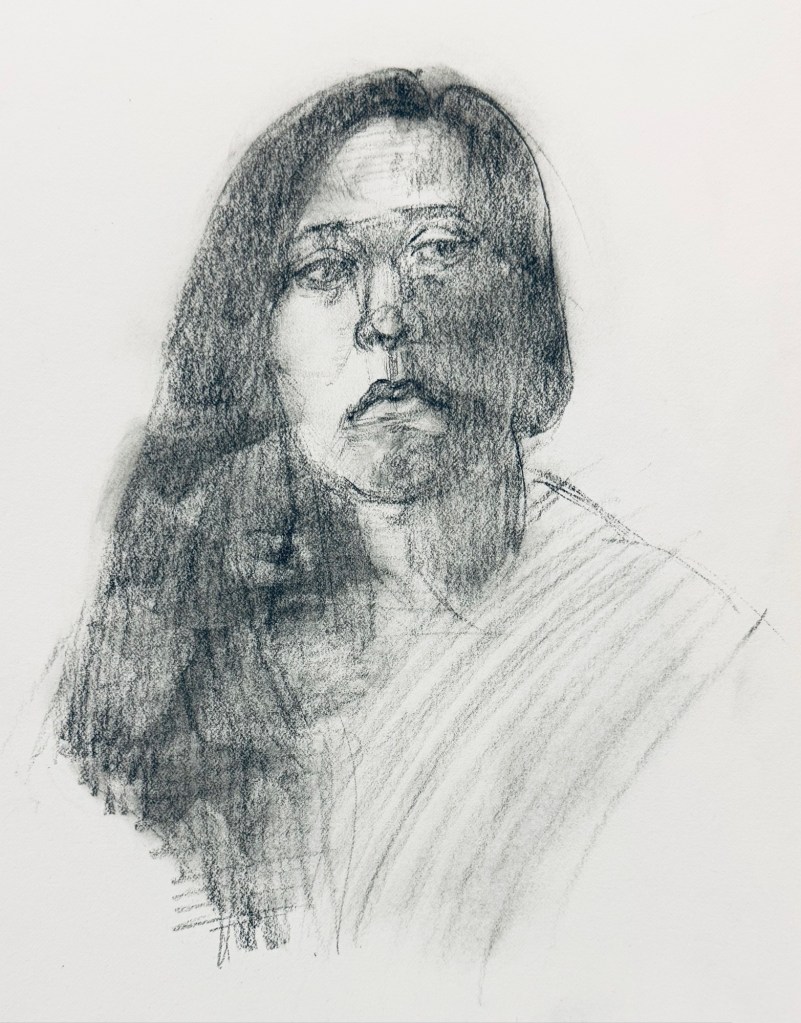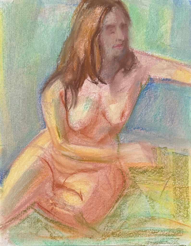 Recent studio work painting out another life study. The original drawing contained a lot of searching lines and rough guesses as I sought to rearrange the legs and dramatically alter the head placement to add emotion to the pose.