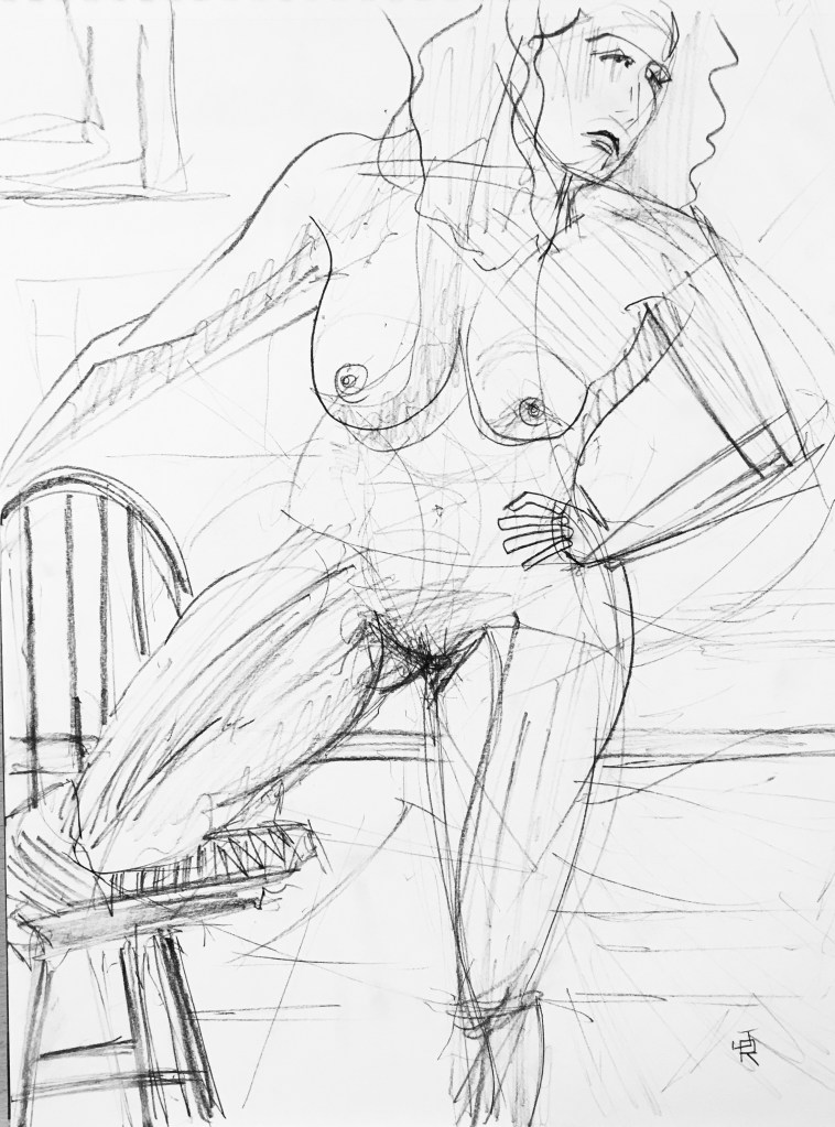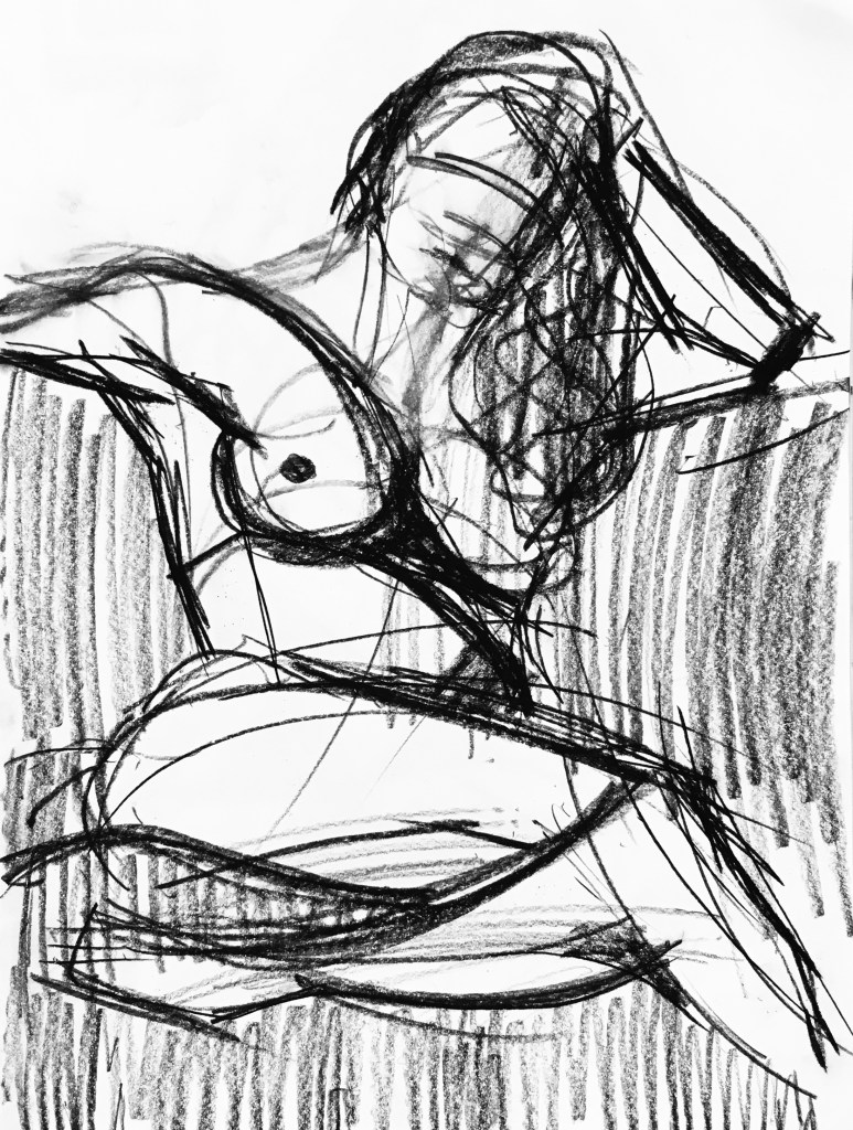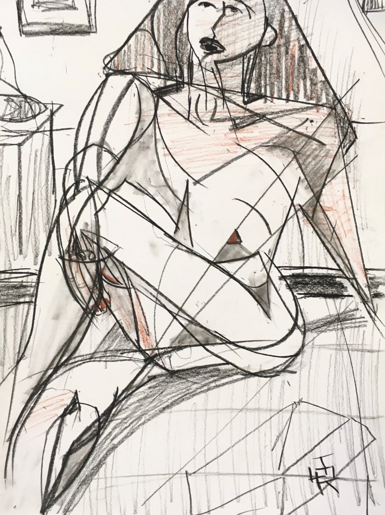 I wanted to bring color to the life room but didn’t want to deal with the soft greasy mess of oil pastels or the dusty byproduct of the soft pastels I’ve always been fond of. (Now that I think about it, Covid time would have been the perfect time to be blowing or brushing cadmium red particulate all over the place; but we’re maskless these days, so…) I’m not lazy, per se (yes I am), but I’m not in the habit of painting, especially transporting, setting up, putting away, etcetera, all of the painting things. So, I reached for … wax crayons.