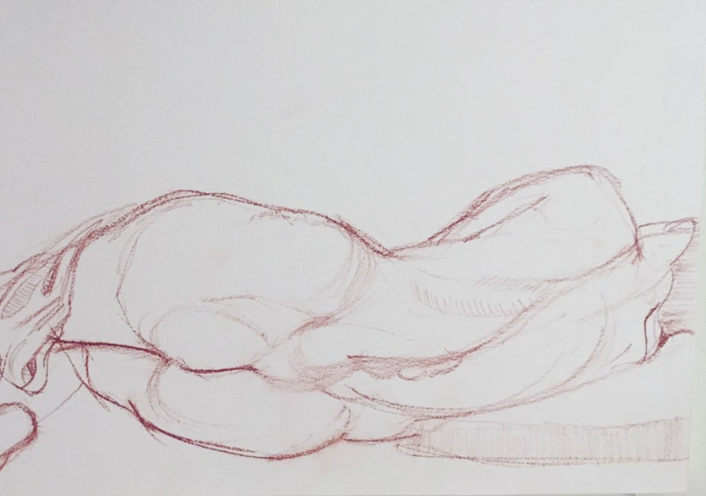 Sunday was not a good day for me. Here is one pose drawn twice within a 25-minute period, first with compressed charcoal, then with Conte pencil. The uneven line work in the pencil sketch will be evened out (or obliterated) with further rendering work.