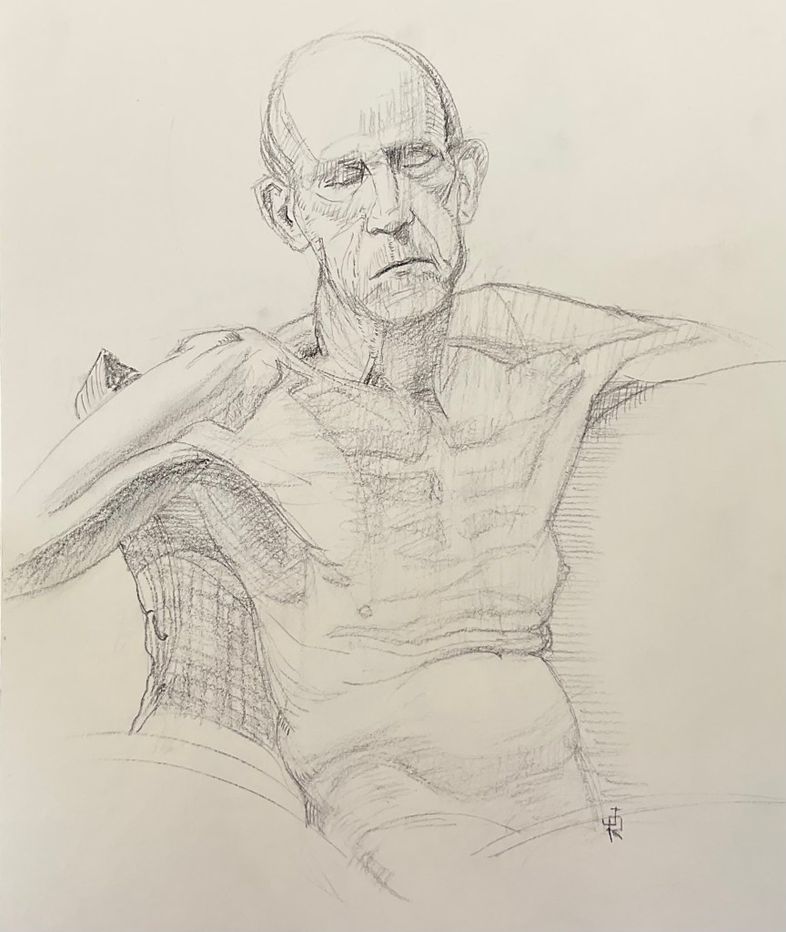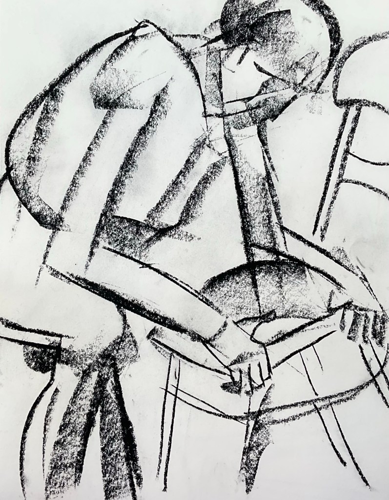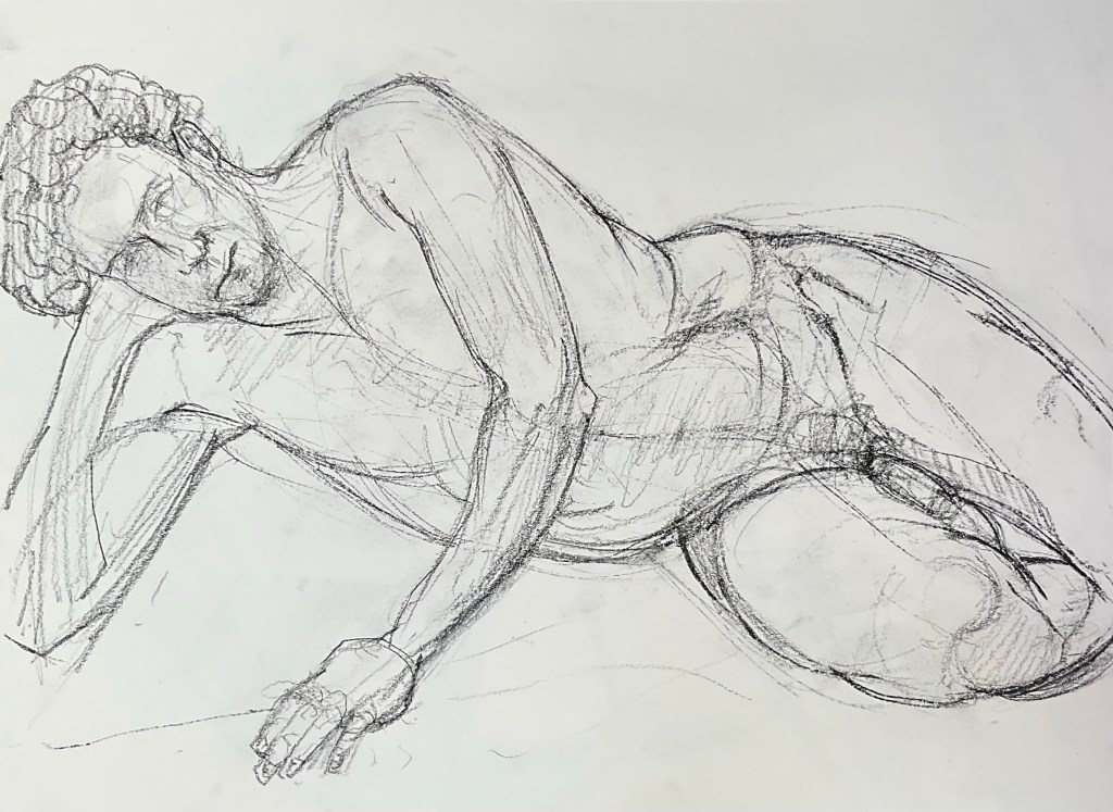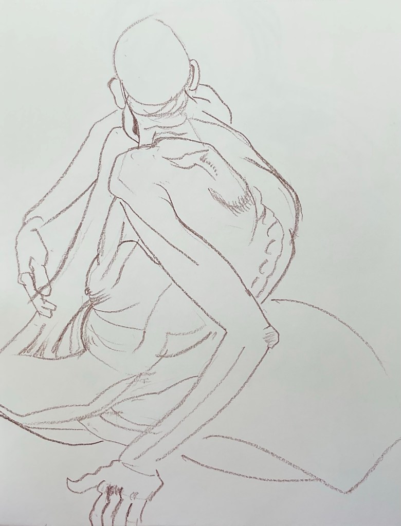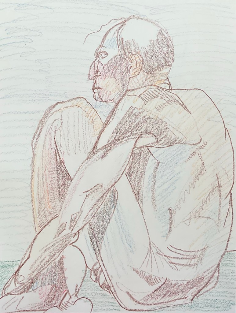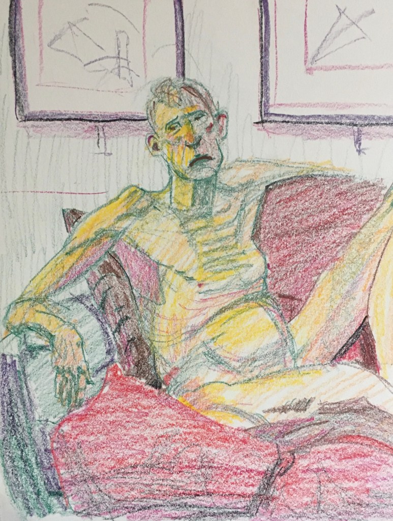 I wanted to bring color to the life room but didn’t want to deal with the soft greasy mess of oil pastels or the dusty byproduct of the soft pastels I’ve always been fond of. (Now that I think about it, Covid time would have been the perfect time to be blowing or brushing cadmium red particulate all over the place; but we’re maskless these days, so…) I’m not lazy, per se (yes I am), but I’m not in the habit of painting, especially transporting, setting up, putting away, etcetera, all of the painting things. So, I reached for … wax crayons.