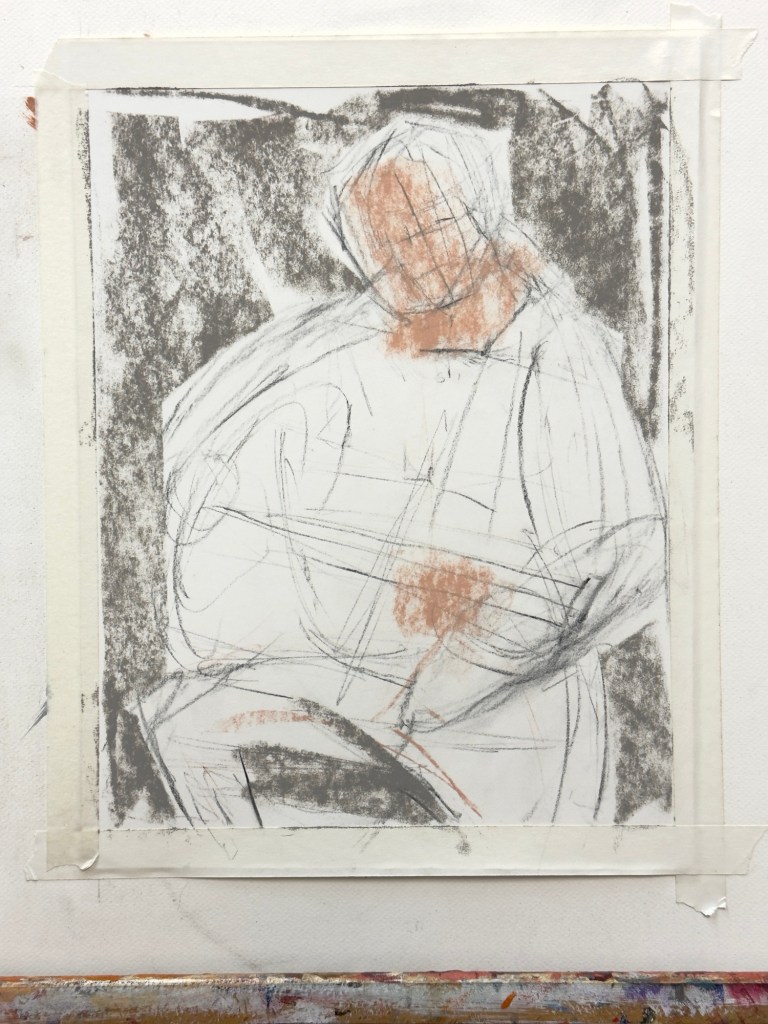 Recent studio work painting out another life study. The original drawing contained a lot of searching lines and rough guesses as I sought to rearrange the legs and dramatically alter the head placement to add emotion to the pose.